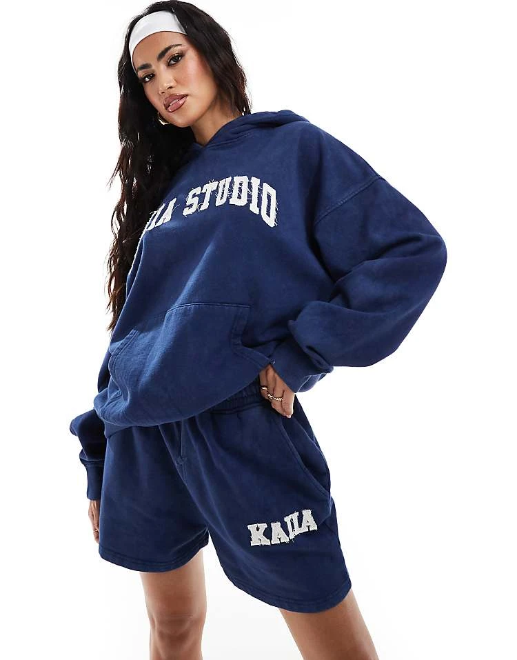 Kaiia Applique Logo Oversized Hoodie And Sweat Shorts Co-ord In Denim Blue