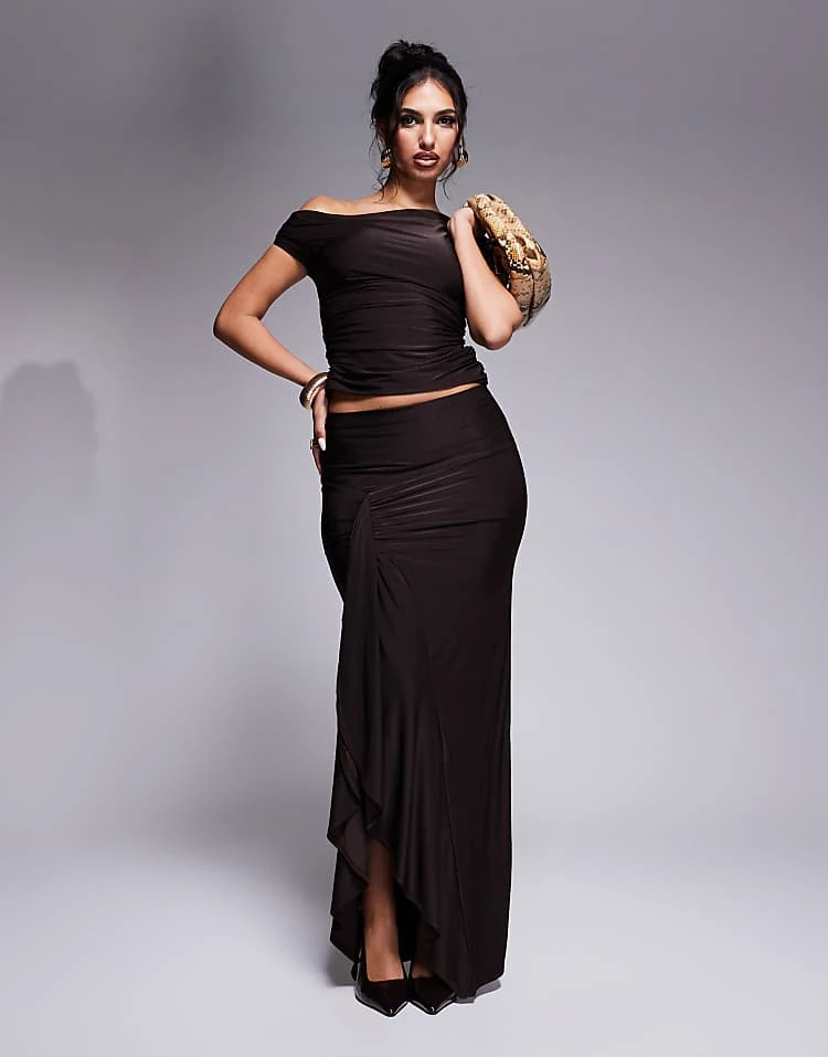 Kaiia Asymmetric Slinky Off Shoulder Top & Drape Detail Maxi Skirt Co-ord In Chocolate