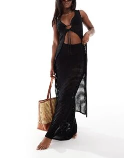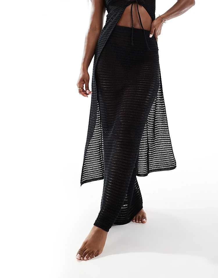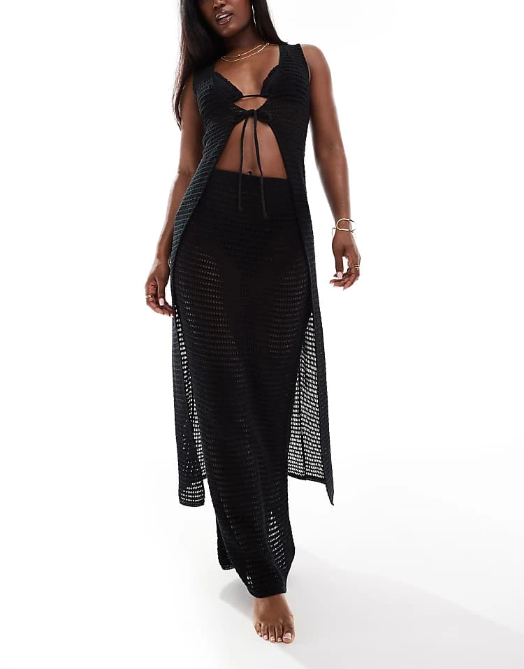 Kaiia Crochet Knit Tie Front Maxi Top And Beach Skirt Co-ord In Black