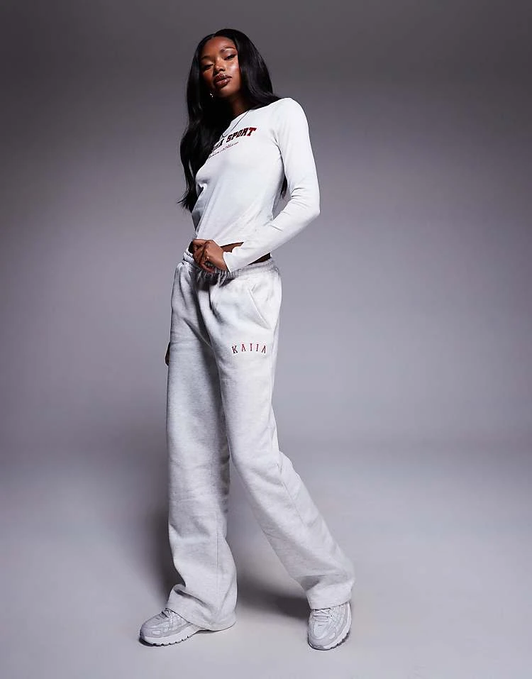 Kaiia Embroidered Logo Cropped T-shirt, Hoodie And Wide Leg Joggers Co-ord In Light Grey Marl And Red