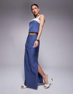 Kaiia Exclusive Contrast Satin Detail Cami Top & Tailored Pocket Detail Skirt Co-ord In Blue