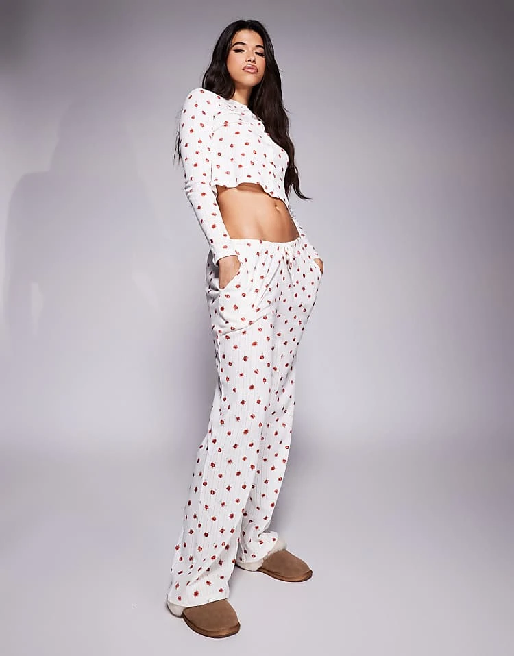 Kaiia Exclusive Cropped Button Through Pointelle Pyjama Top And Bottoms Co-ord In Red Ditsy Floral
