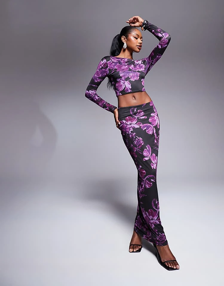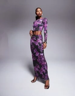 Kaiia Exclusive Low Back Slinky Long Sleeve Top And Maxi Skirt Co-ord In Purple Print