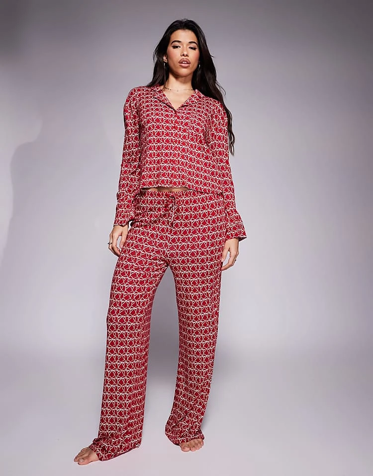 Kaiia Exclusive Mix And Match Cropped Button Through Pyjama Top, Shorts And Bottoms Co-ord In Burgundy Bow Print