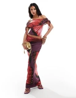 Kaiia Exclusive Slinky Off Shoulder Crop Top And Maxi Skirt Co-ord In Red Flower Print
