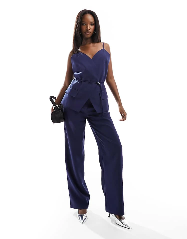 Kaiia Longline Waistcoat And Wide Leg Trousers Co-ord In Navy