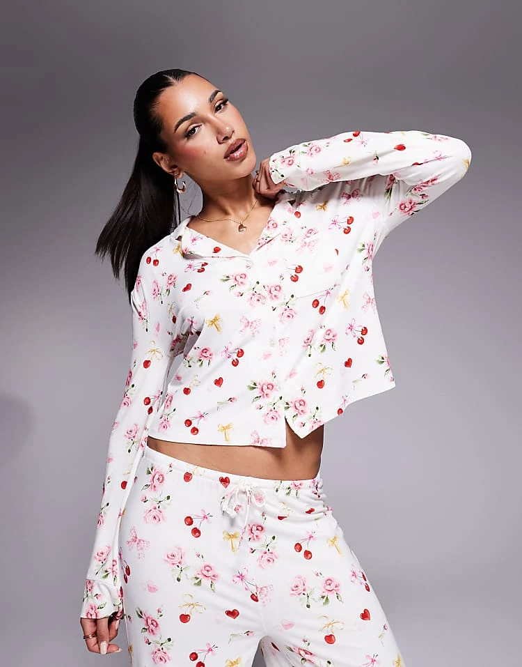 Kaiia Mix And Match Pj Shirt, Short, Bottoms And Robe Co-ord In Cherry Rose Bow Print