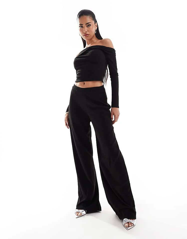 Kaiia Ribbed Ruched Bardot Off Shoulder Top And Wide Leg Trousers Co-ord In Black