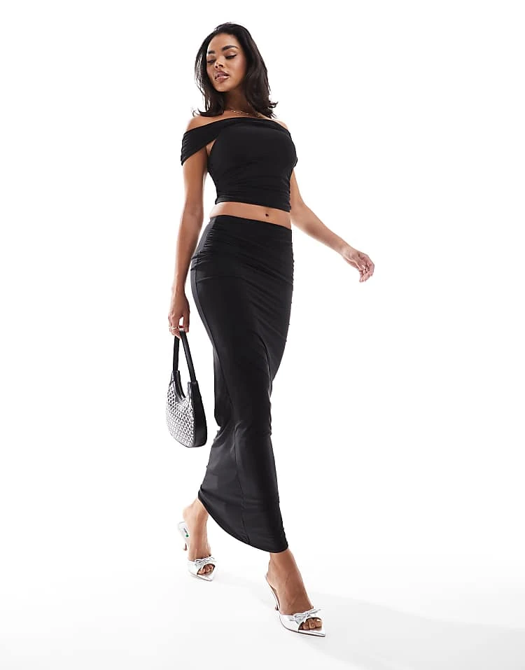 Kaiia Slinky Drape Off Shoulder Top And Maxi Skirt Co-ord In Black