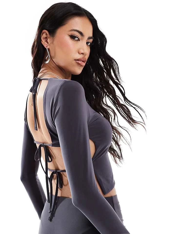 Kaiia Slinky Long Sleeve Tie Back Top And Midi Skirt Co-ord In Charcoal