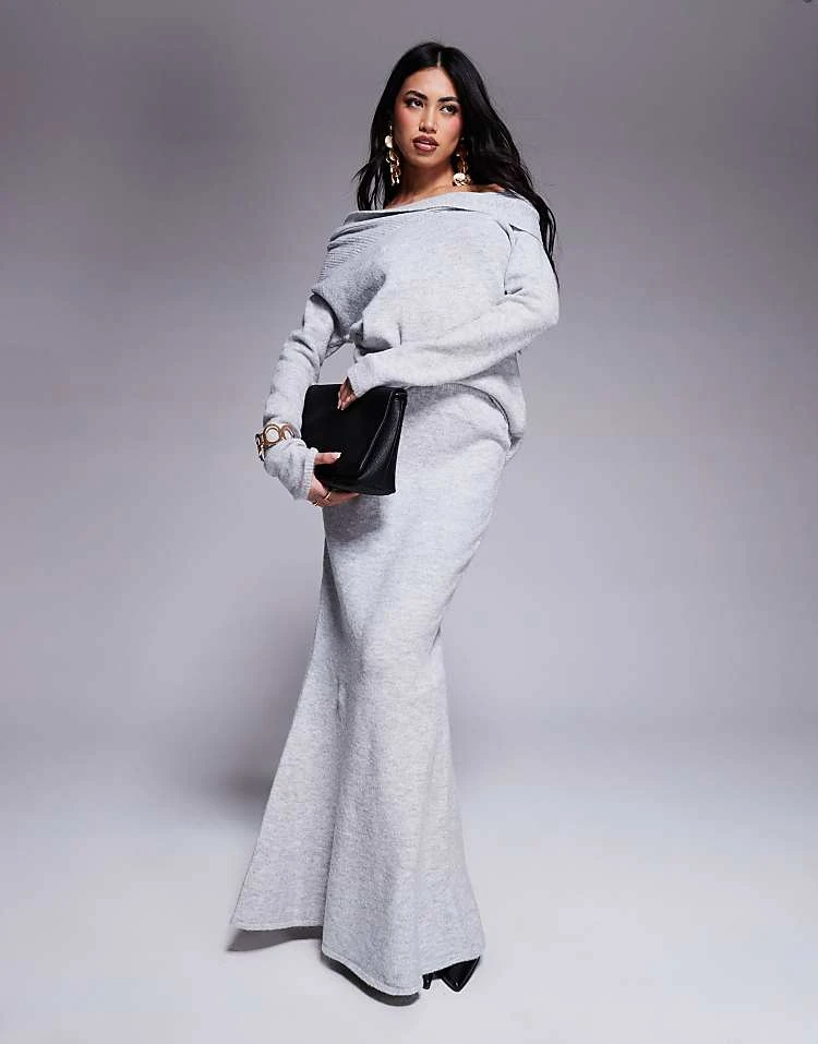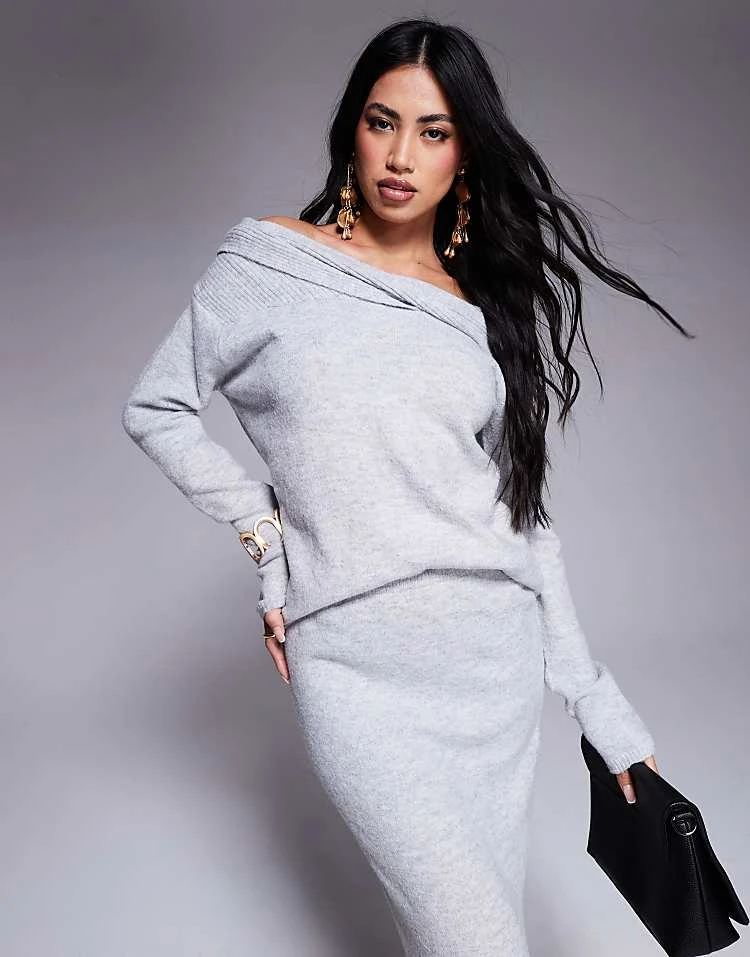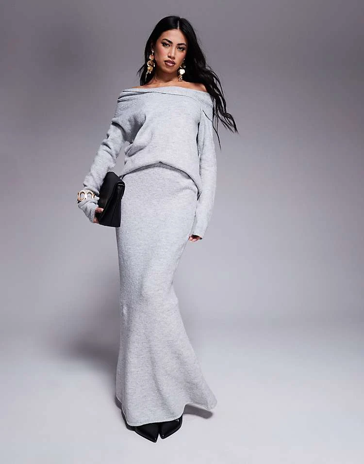 Kaiia Twist Front Bardot Jumper And Maxi Skirt Co-ord In Grey
