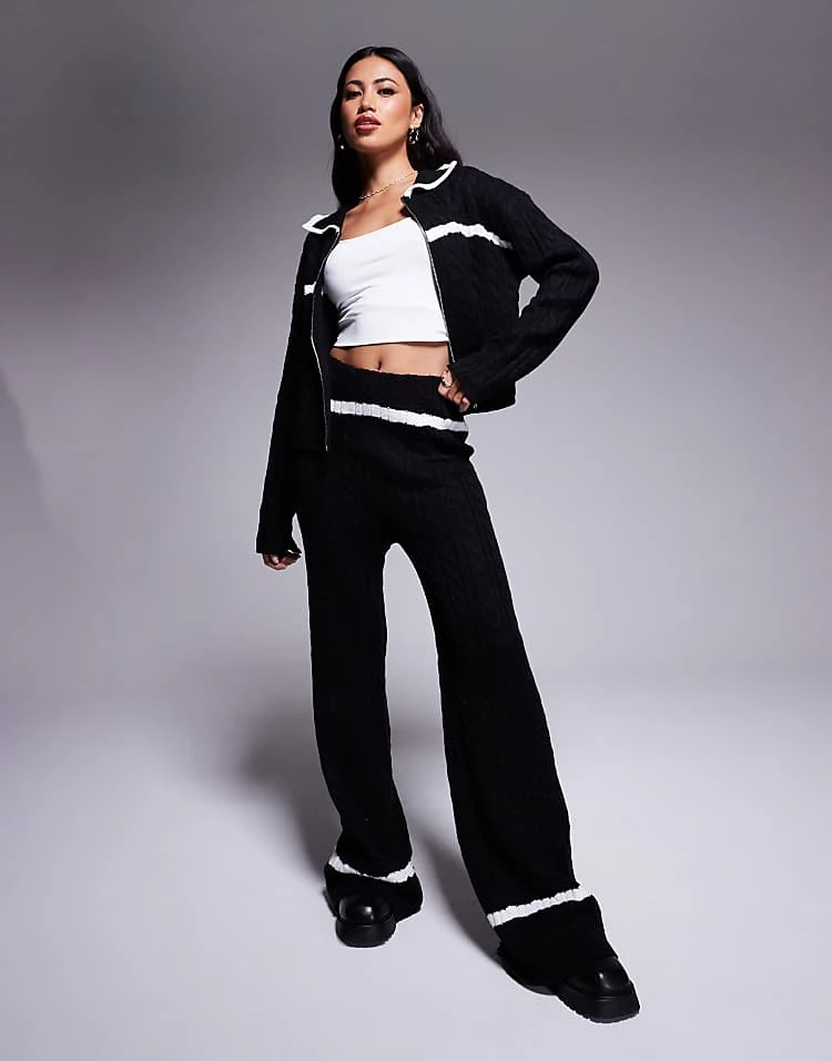 Kaiia Zip Through Collar Detail Jumper And Wide Leg Contrast Stripe Trousers Co-ord In Mono