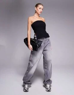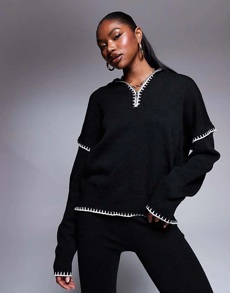 Kaiia Zip Through Contrast Stitch Oversized Jumper And Wide Leg Trousers Co-ord In Black