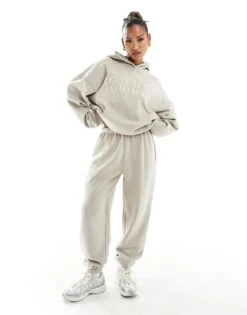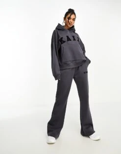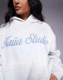 Kaiia Embroidered Script Hoodie Co-ord In Grey Marl And Blue For Women