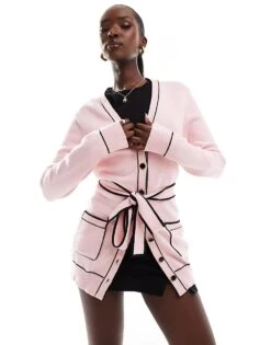 Kaiia Contrast Trim Pocket Detail Tie Waist Cardigan In Pink For Women