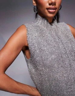 Kaiia Exclusive Funnel Neck Boucle Knitted Zip Through Sleeveless Jumper In Charcoal For Women