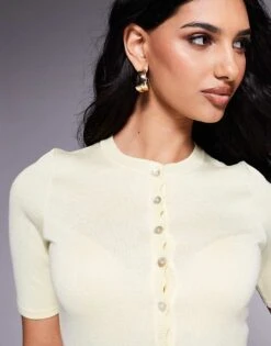 Kaiia Exclusive Scallop Button Front Short Sleeve Cardigan In Butter Yellow For Women